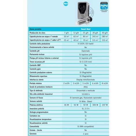 Gli sterilizzatori salini Smart next hanno l’elettrodo autopulente, sono disponibili con una larga scelta di potenze dimensionabili alla capacità di ogni piscina. Installabile su qualsiasi genere di piscina esistente o in costruzione, permettono di avere un’acqua batteriologicamente pulita senza ricorrere alla costosa, costante, immissione di cloro. Progettato per un utilizzo semplice e di facile manutenzione, i componenti elettronici sono i migliori reperibili sul mercato Europeo, gli elettrodi sono prodotti in lega di Titanio con garanzia totale di 2 anni.