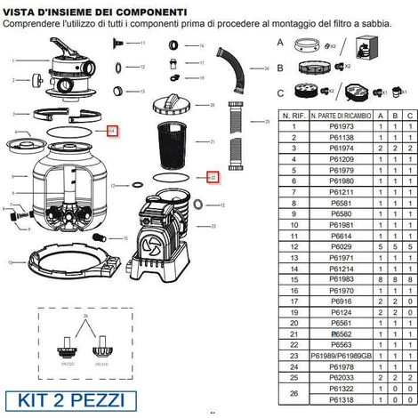Il kit comprende 2 guarnizioni per il filtro: 1 pezzo P6563 (Rif. figura 22) • 1 pezzo P61214 (Rif. figura 14).