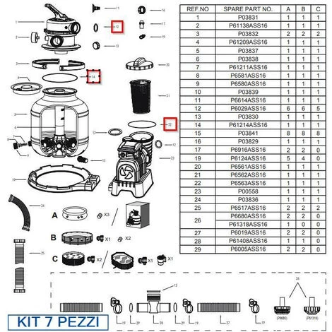 Questo Kit comprende 7 guarnizioni corrispondenti ai seguenti codici: 5 guarnizioni P6029 (Rif.12), 1 guarnizione P61214 (Rif.14), 1 guarnizione P6563 (Rif.22)