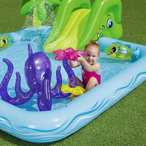 Questo bellissimo playground gonfiabile è dotato di mini scivolo gonfiabile,fiore con spruzzo d’acqua funzionante tramite l’apposito attacco con la pompa da giardino, grandissimo polpo con tiro al bersaglio da utilizzare con le apposite stelline gonfiabili e di pesciolino e delfino gonfiabili.