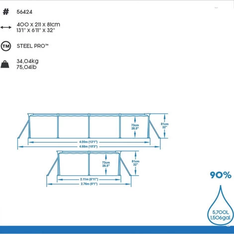 SPECIFICHE PRODOTTO:Marca: BestwayCapacità: 5.700 LitriDimensioni del prodotto: 4L x 2.11l x 0.81H metriForma: rettangolarePompa filtro da 1,249 L/h inclusaColore: bluMateriale: Cloruro di polivinile