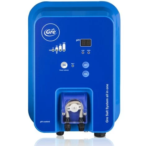 – Elettrolisi del sale con unità di controllo del pH e pompa per il dosaggio del prodotto chimico per piscine fuori terra e interrate.
