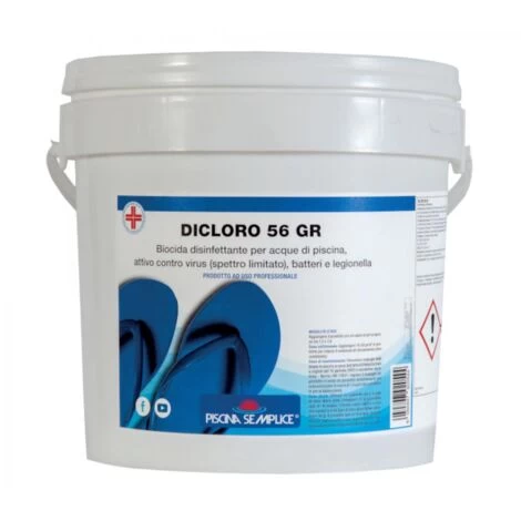 DICLORO GRANULARE è un prodotto specifico per la clorazione dell’acqua di piscina, indicato per la sua rapida dissoluzione e per l’assenza di residui idrosolubili. Evita il deterioramento dell’acqua. Il prodotto è stabilizzato in modo da prolungare la durata del cloro in acqua riducendone i consumi: è a base di dicloroisocianurato sodico biidrato al 56% di cloro attivo stabilizzato. Lo stabilizzante rallenta la decomposizione e la perdita del cloro in occasione di giornate assolate su piscine scoperte. Il prodotto è indicato per: a) trattamenti shock all’apertura e alla chiusura della piscina, b) trattamenti shock ogni 15 giorni per il normale mantenimento dell’acqua c) trattamenti aggiuntivi in caso di formazione di alghe verdi, in caso di grande afflusso di bagnanti, dopo giornate particolarmente calde, dopo abbondanti piogge, quando è necessario avere cloro disponibile nell’acqua in tempi rapidi.