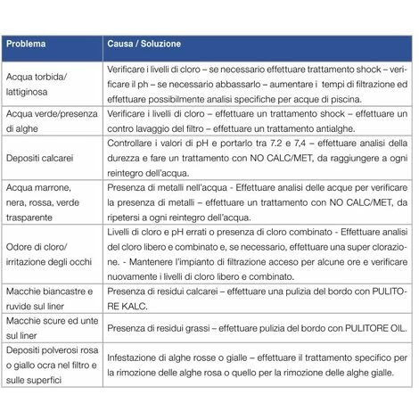 – Se possibile, effettuare analisi specifiche per le acque di piscina; in presenza di acque particolar-mente dure o ricche di metalli, effettuare trattamento sequestrante dei metalli e del calcare con NO CALC/MET (la dose varia in base alle condizioni dell’acqua.)