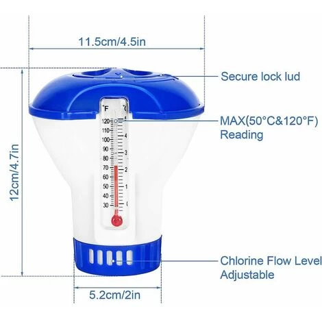 Dispenser multifunzione 2 in 1 – Il distributore di prodotti chimici galleggiante ha anche un termometro integrato. Chi può leggere la temperatura? e ?. L’intervallo di temperatura è compreso tra 0 ° C e 50 ° C / 30 ° F-120 ° F. Se la piscina controlla il rilascio di cloro, puoi monitorare la temperatura della piscina per mantenerla pulita.