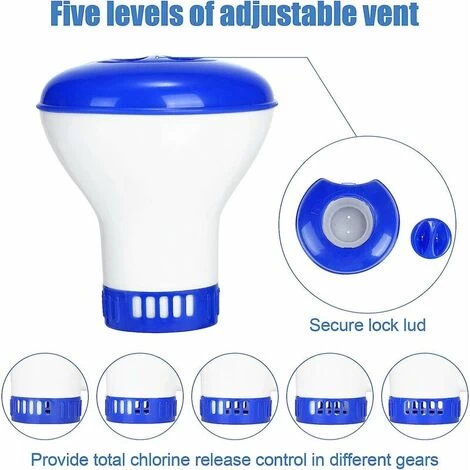 Dispenser a sfera galleggiante – Questo distributore di cloro galleggiante ad alte prestazioni è progettato per l’uso con acqua. con pastiglie per mantenere un flusso costante di cloro nelle piscine o sorgenti termali. È possibile regolare facilmente il flusso del farmaco in base alla situazione effettiva nel pool di farmaci. Cinque livelli possono essere regolati in base alle proprie esigenze. esportare, risparmiare sui costi del cloro e ridurre la clorazione e la clorazione insufficiente.