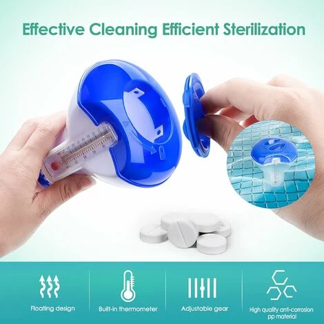 - Distributore con termometro: un termometro a cheroseneun è incluso nel dispositivo Si può rilevare la temperatura della piscina facilmente durante la disinfezione, il campo di misura: – 30 – 120℃.Il termometro è di kerosene invece di alcool, anche se si rompe il prodotto accidentalmente, facile da pulire non c’è bisogno di preoccuparsi.