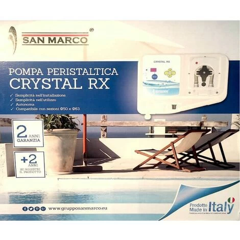 Il regolatore di cloro San Marco Crystal Rx con pompa peristaltica per piscine interrate o fuori terra stabilizza il cloro, ottimizzando l’efficacia del trattamento di pulizia dell’acqua. La pompa peristaltica con dosaggio continuo proporzionale è completa di kit e accessori per il montaggio. La pompa è prodotta in Italia. Garanzia 2 anni + 2 anni se registri la matricola sul nostra sito. Mentre i componenti soggetti a usura godono della garanzia di legge di 6 mesi.