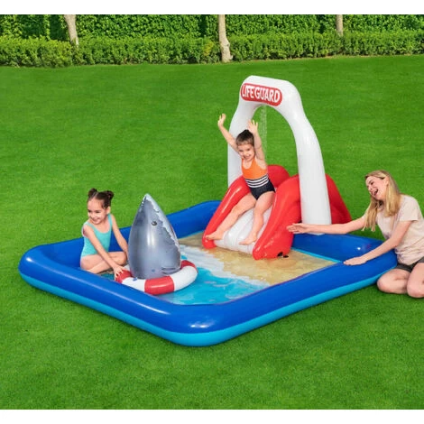 Lasciate che i più piccoli si divertano con i giochi gonfiabili di Bestway! Questo divertente centro giochi ha milioni di possibilità per giocare per ore. È possibile collegare un tubo al gonfiabile e l’acqua uscirà dalla torre, i bambini potranno anche divertirsi a saltare dallo scivolo gonfiabile incluso o giocare con lo squalo come sacco da boxe. Quando il gioco è finito, basta svuotare l’acqua con la valvola di scarico e ripiegarlo per riporlo.