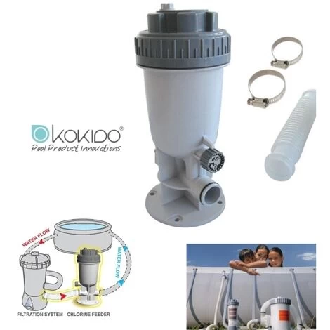 Il dosatore di cloro automatico KlorIn collegato in linea con il gruppo filtrante, consente di dosare le pastiglie di cloro in maniera del tutto semplice e automatica.