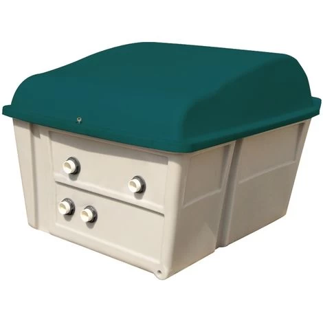 Locale tecnico in PE dotato di predisposizione scarico condensa, cerniere preassemblate, serratura, bordo a tenuta rinforzata 1 bocchetta di aspirazione 1 mandata da 50 mm