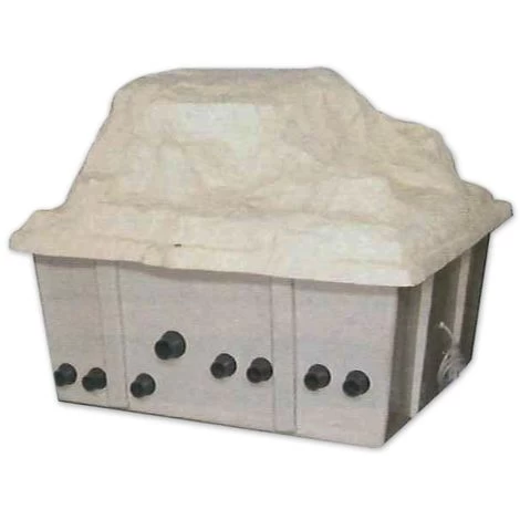 Progettato con chiusura di design, dotata di maneggevole apertura pneumatica, si inserisce elegantemente nei giardini spaziosi, per contenere le apparecchiature come una roccia mediterranea che fuoriesce armoniosamente dal terreno.
