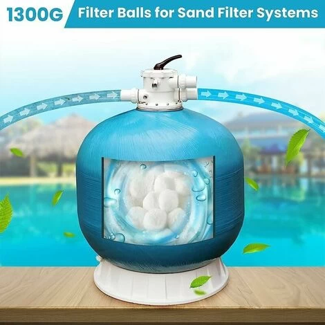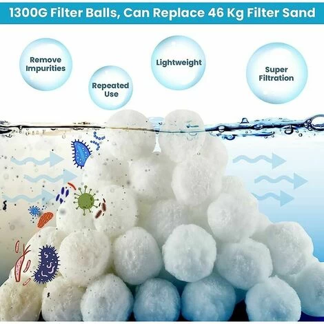 Universalmente applicabile Le singole sfere del filtro del diametro della piscina sono 50 60mm e il peso totale è di 1300g. Filterball è universalmente utilizzato in vari sistemi di filtro a sabbia, non blocca sistemi di filtro a sabbia ed è adatto anche per l & #39; acqua sporca. Può filtrare non solo per piscine, ma anche per acquari, bande, ecc.