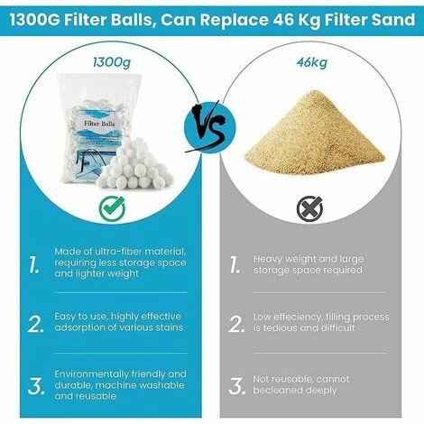 Durevole, riciclabile Non inquinare L & #39; ambiente Le sfere filtranti possono essere lavate e riutilizzate. Pulendo la macchina e la mano, può essere prima della lavatrice senza agglomerazione. Le sfere del filtro della piscina hanno una capacità d & #39; assorbimento della polvere di leve, è quindi trs durevole e può durare il lavaggio contro la corrente. In questo modo puoi risparmiare l & #39; energia, culle e d & #39; altri accessori per la piscina ..