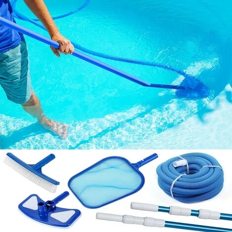 - La fornitura comprende il set da piscina completo composto da un’asta telescopica in 3 parti, un tubo flessibile spiralato e i tre accessori spazzola, retino e aspiratore da piscina.