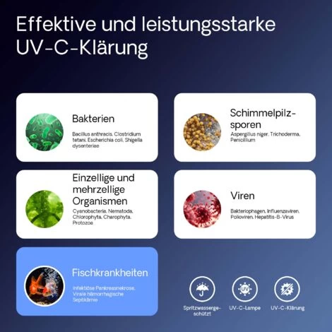 Nell’acqua di scorrimento sono così eliminati germi e batteri nocivi; ma la riduzione dei microbi non ha effetti negativi sul microclima del laghetto, perché i batteri, che sono utili all’equilibrio biologico dello stagno e che eliminano alcune tossine, si posano sulle pietre e possono lì proliferare. La lampada UV contribuisce dunque a far sì che il tasso dei microbi si sviluppi in modo quasi naturale.