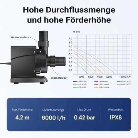 • SunSun CPP-8000F: potenza: 62 W, altezza di mandata: 6,0 m, portata: 5000 l/h (con tubo di 1,2 m x ø32 mm)